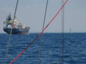 There are many anchorages on both sides of the Gulf of Suez and after our recent experiences of night sailing when the wind always seems to pick up we decide to anchor each night on the way to Port Suez.The anchorages are variable and we stayed on the west side for the first two nights. The first anchorage Endeavour Harbour was very scenic with desert meeting the sea but the next stop was less attractive we were near an oil rig of which there are many in the Gulf of Suez. The following morning we crossed the shipping channel and and suddenly there seemed to be lots of large vessels in the way. Of course they are still relatively close coming south as they all enter and therefore leave the Suez canal in convoy.