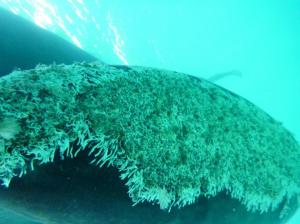 - We were persuaded to have a copper-based antifouling manufactured by Oceoprotec. This was done at the last moment and slowly so that we had to stay an extra week on the hard (after 6 months!). The last touches to the areas around the seacocks was being applied as the boat was being lifted into the water. Much more seriously after 4 months heavy growth appeard on the bottom of the keel, leading and aft edges and various other patches (see figures). The rudder edge also has growth. This is separate from the slime which accumulates if the boat is in harbour. This is after only 4 months and the product is guaranteed to keep the hull clean for 5 years! (we were told and confirmed on their web page). We have now to divert to Port Leucate in France to have this redone.