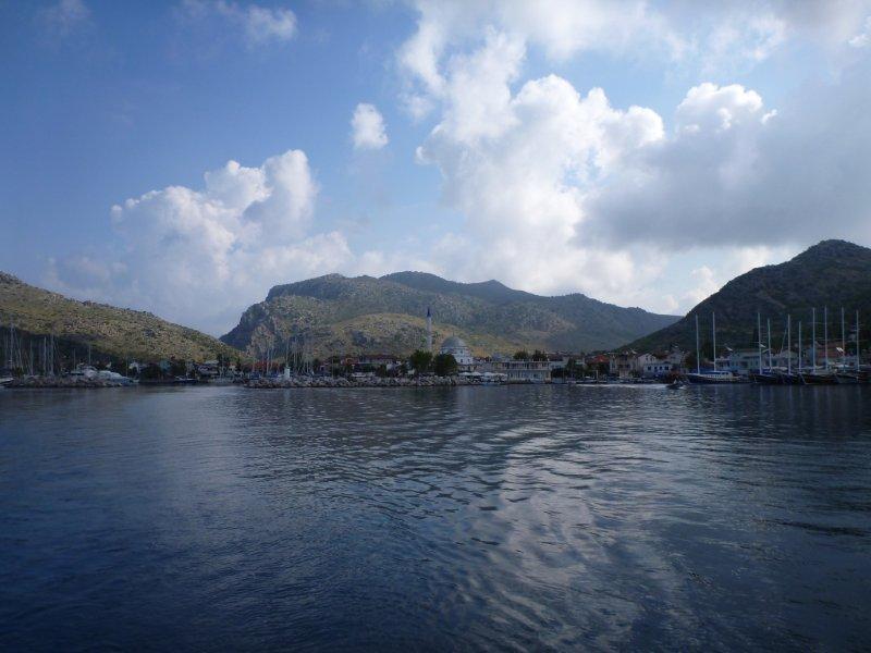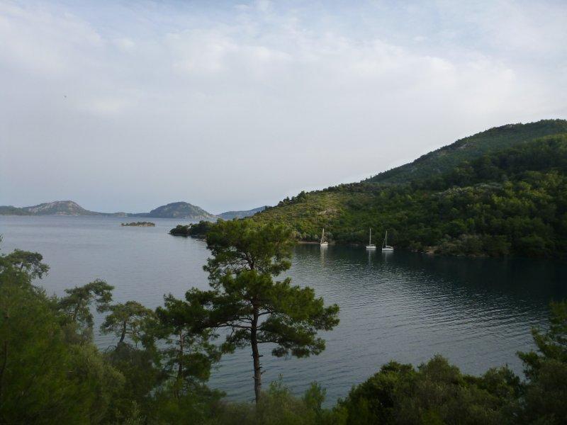 We planned an early start for the next Greek island to the west, Nisos Nisiros and were waved off by Chris at 7.00 am. We could see Nisiros in the distance, the wind was good despite the early hour and although on the nose we felt we had time to tack our way west and sailed easily at 4 kts just starting to think the traumas of Gocek were behind us and it had all been worth it .At 10.00 am the steering failed ,the new cable had lasted only 5 days !After a significant number of expletives and much use of the retrospecoscope we used the autohelm to return to Turkey to get it fixed . We anchored in Semiye luckily a beautiful bay almost like a lake it is so cut off from the open sea .We were obviously unable to moor stern to without any steering but there was plenty of anchoring space and good holding. Our annoyance was mitigated somewhat by the beauty of the surroundings and the pleasant climate , I think we would have felt even worse if it had been cold and wet. The workers came the next day and mended the cable but hardly appreciated the gravity of their error .There was certainly no apology. So take two and we hope to be in Greece tomorrow heading directly for Nisiros about 40 nm away. All digits crossed now !