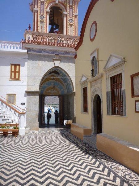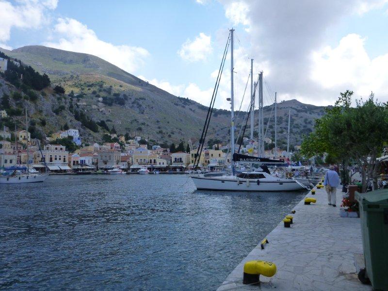 Significantly poorer we finally departed on Saturday 25th May in beautiful weather and had a wonderful first days sailing heading westwards to Bozburun to finally leave Turkey. We had two nights at anchor en route both in very beautiful places and finally left Turkey on 29th May.Checking out at Bozburun was easy and we lowered the Turkish flag once out of Turkish waters with some relief hoping we were at last on our way.We sailed to Symi the closest Greek island and were lucky with the wind that day .Minarets metamorphosed to church towers and we arrived to be greeted by Skylark one of our convoy companion.After a 4 hour check in procedure ,rather longer than we expected ,we finally had supper with Skylark and caught up on all the news .We enjoyed a fun day out on 30th May with Chris and Desiree touring the island on motorbikes.Symi is a dramatically mountainous island ;we visited a Greek monastery and had a delicious Greek lunch of Dolmades, tatzliki, Symi prawns and Greek salad eating in yet another scenic bay.Symi town is picture post card material with well maintained neoclassical houses climbing up the mountainside painted in warm colours, yellows, reds and browns with white trim, really very elegant .