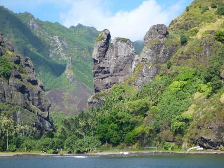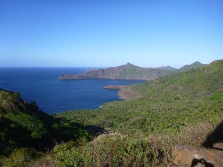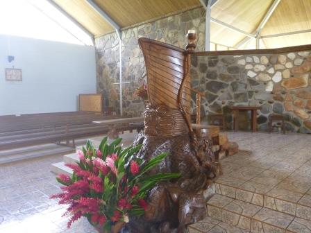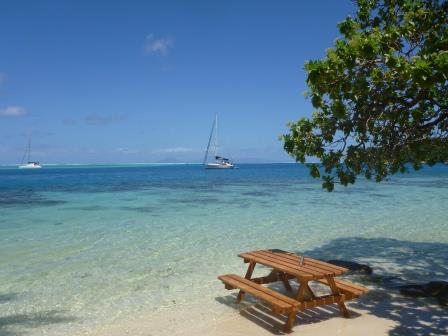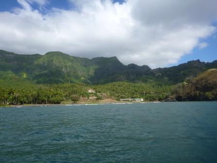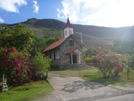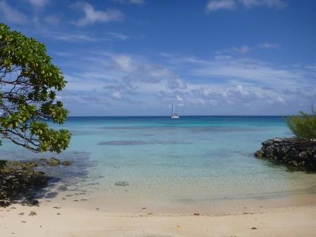 We left the next morning happy with the unexpected improvements to the boat and sailed down the west coast as far as it is navigable inside the lagoon and found some government buoys which we had heard had been laid earlier this year so could be trusted. Another beautiful bay with the oldest protestant church on the island in view, curiously built on the site of an ancient Marae (traditional Polynesian religious site).