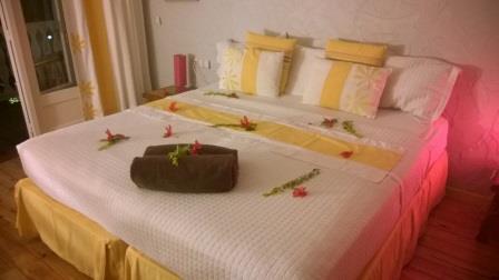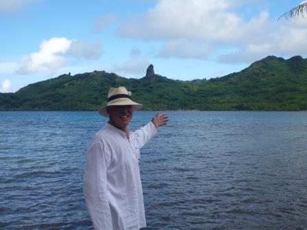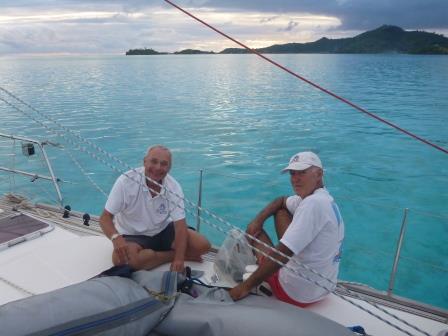 We moved speedily to Uturoa the main town on the island with shops mainly run by Chinese who have significantly changed the opening hours on the island! Just as we were preparing to shop a Canadian Richard walked by on the pontoon and greeted us giving us a card stating he was a marine electrician. John casually asked him if he could mend our electric winch switch expecting nothing but he jumped at it saying he had fixed many before. He started work immediately and indeed did fix the switch after a couple of hours work. Encouraged we asked him about the wind generator and again this was to be no problem to fix. It was late afternoon so he arranged to return the next morning and tackle it .We were then committed to stay alongside the town quay but the stay was enhanced by finding some excellent live music in the local café. Next day Richard returned and after several set back and a few hours with John as electrical apprentice we had a working wind generator …full marks for persistence. We again enjoyed the music that evening in the company of two lovely ladies in their flower headdresses.