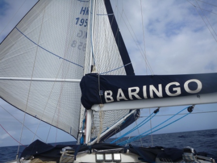 We started work on the boat in earnest on our return from the Galapagos . Baringo was on the hard for a few more days and we stayed in a nearby hotel in La Libertad , adequate but not luxurious ! We ate at the deserted Puerto Yacht Club where the restaurant had about 5 waiters and as many cooks and although we were usually the only diners, it still took around 35 minutes for the food to be produced! Luckily the TV worked much better than the internet and we could watch some football for light relief . Monday 30th June was the day Baringo re-entered the water at 5.00pm with the high tide .A nerve racking few moments but all went well and we parked over in the marina .The next day the sails went up and Glynis and I bought the provisions for the long voyage as the supermarket here was closer to the boat, only the fresh food was left until later .Malcolm and John were given free rein for their shopping and it now seems there will be no shortage of wine!