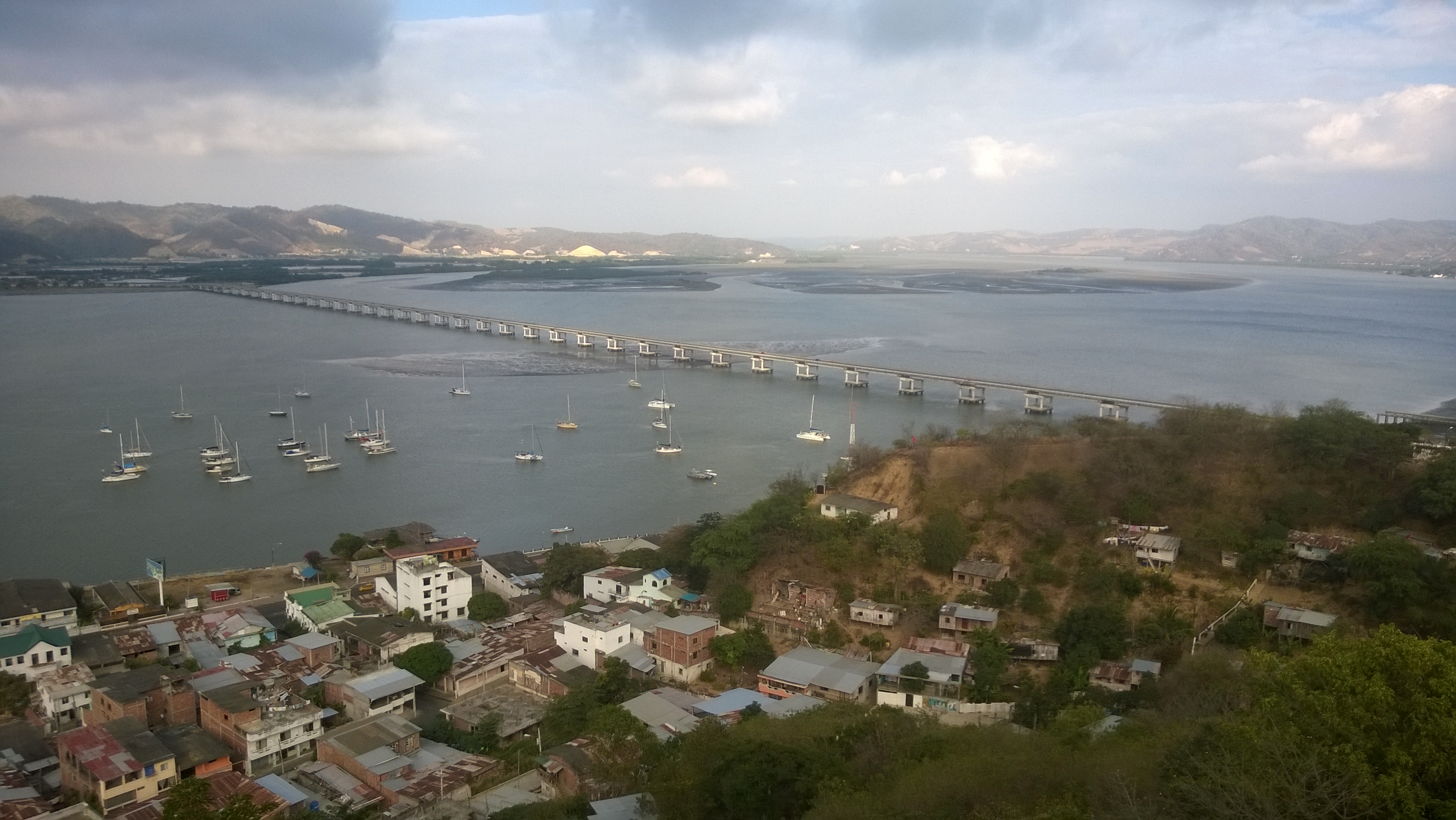 We made good speed and arrived at Bahia de Caraquez in the late evening and the night watch was enlivened by ghost ships unlit accompanying the squid fishing boats. Luckily the wind had quietened so we were able to sail slowly towards the anchorage and avoided collision. We anchored in almost the same spot as last year and as before it was very rolly so the arrival of dawn was very welcome ..when is it not at sea … and the pilot Pedro appeared to guide us in with the high tide .