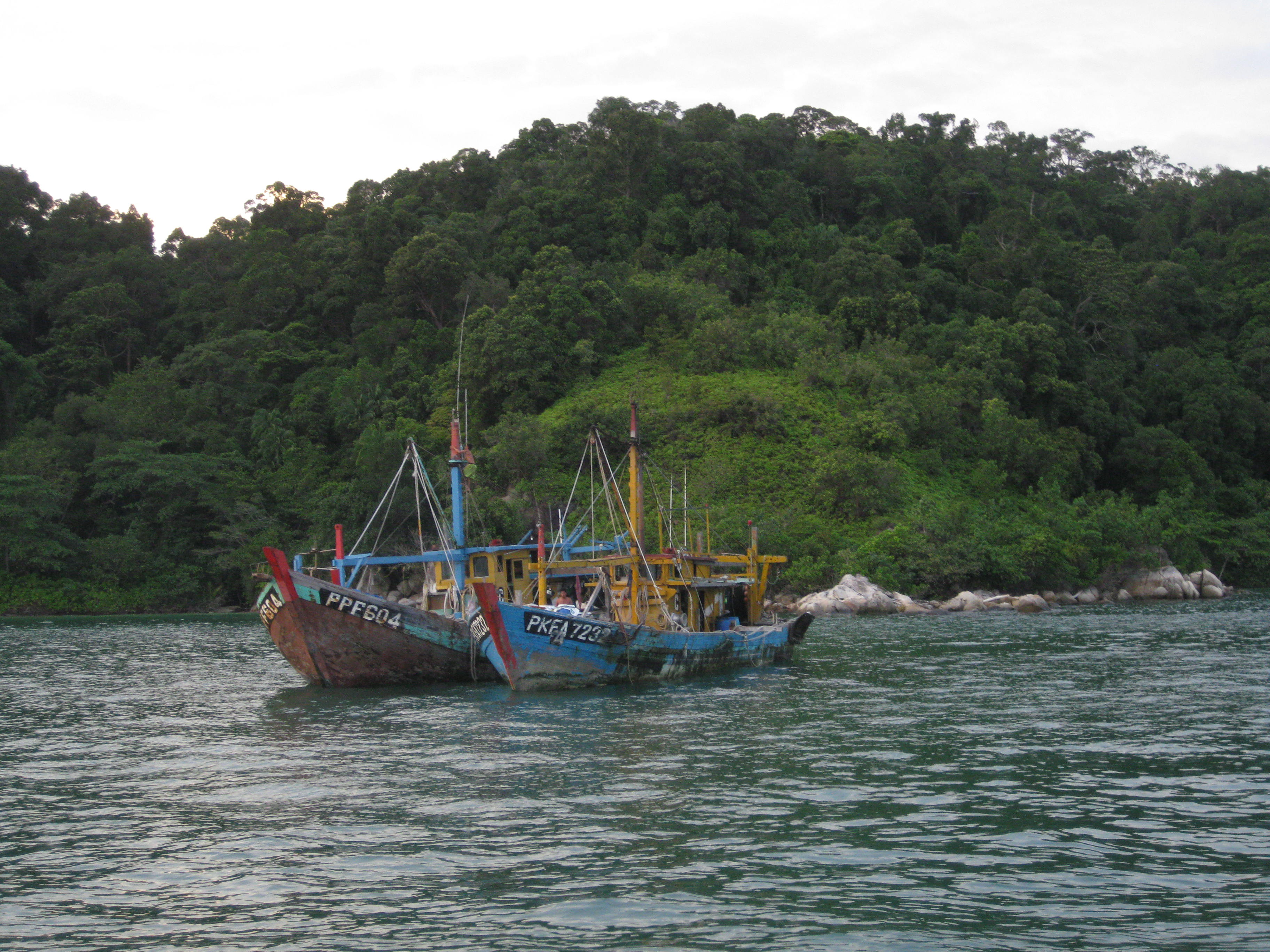 We were trying to sail non stop afer the delay in Singapore but afer an unpleasant first night with ..yes a very wet and windy squall we anchored off the Port Klang estuary for a rest the following night 5th December. Refreshed after a good nights sleep we sailed on ,occasionally having a pleasant 2 or 3 hours sailing and by dawn on Tuesday morning 7th December we had reached the Sembilan Islands near Pilau Pangkor after another night of relatively successful squall dodging.